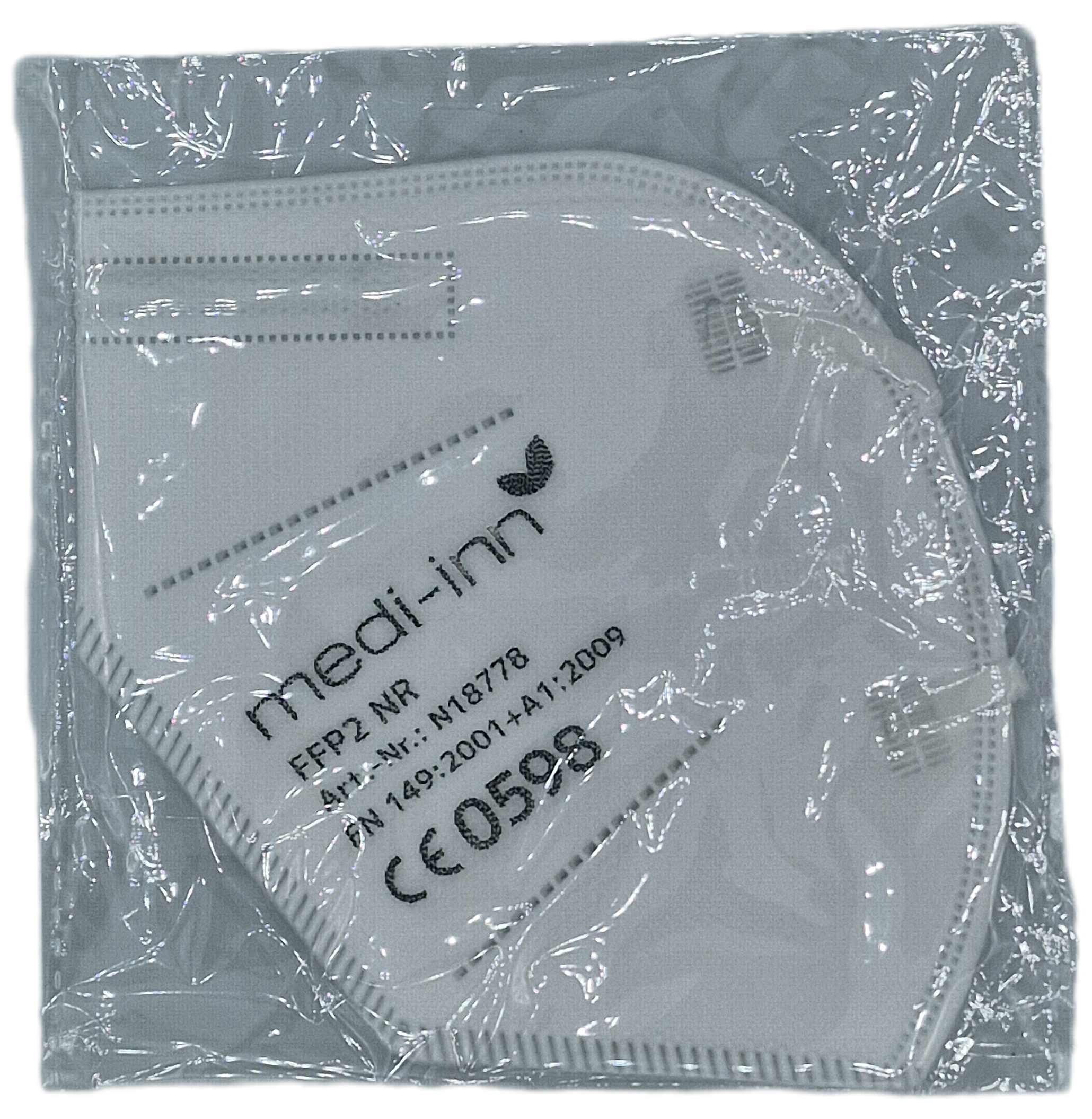 Disposable respirator mask with flexible nose clip, latex-free, individually packaged.